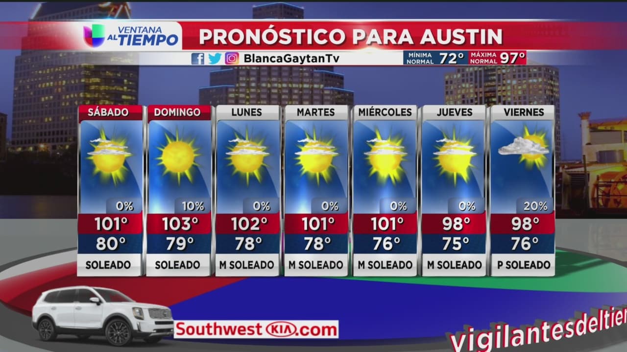 Se prevén cielos despejados y condiciones secas para este fin de semana en la capital texana, se espera que el termómetro alcance una máxima de 101 grados Farenheit para el sábado y 103 para el domingo.