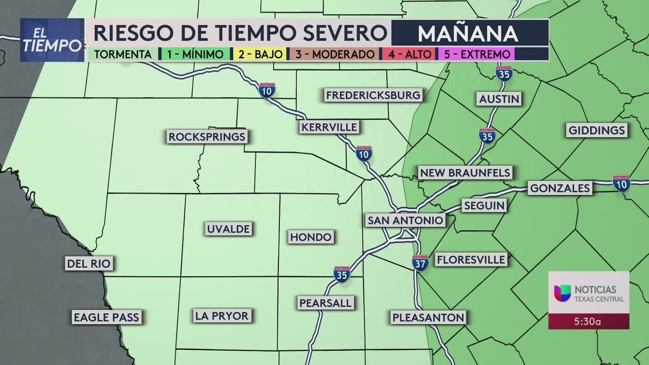 El sistema traerá la posibilidad de lluvias y tormentas el miércoles. De acuerdo con los pronóstico, se espera riesgo de tormentas severas aisladas cerca y al este de los corredores I-35 e I-37. Las ráfagas de viento y el granizo dañinos son las principales amenazas en caso de que se desarrolle una tormenta.