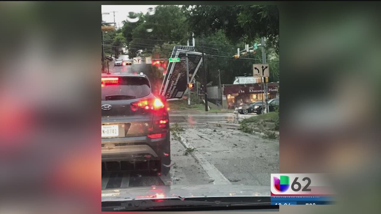 El viento fuerte que acompañó a las lluvias en la capital de Texas provocó daños en Austin como la caída de un espectacular y árboles.
