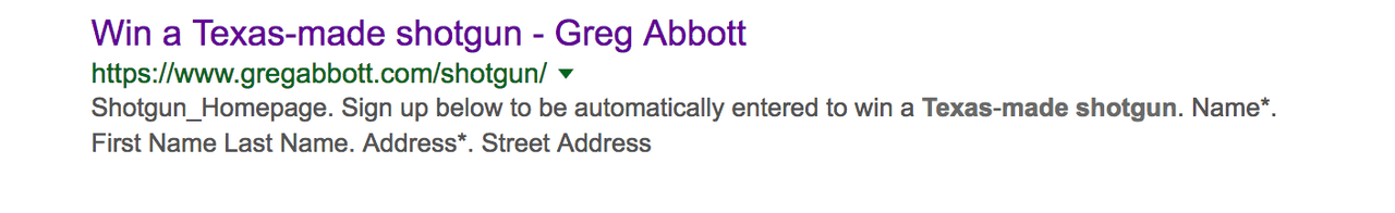 Como parte de su campaña por la reelección, el gobernador de Texas ofrecía la oportunidad de ganar una escopeta a quienes introdujeran sus datos en su sitio web durante el mes de mayo.