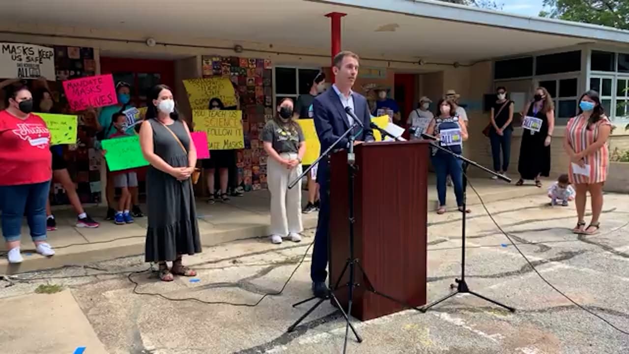 Los miembros del grupo Safe Schools for All están criticando la prohibición de las mascarillas ordenada por el gobernador Abbott en las escuelas públicas y la guía de la Agencia de Educación de Texas.