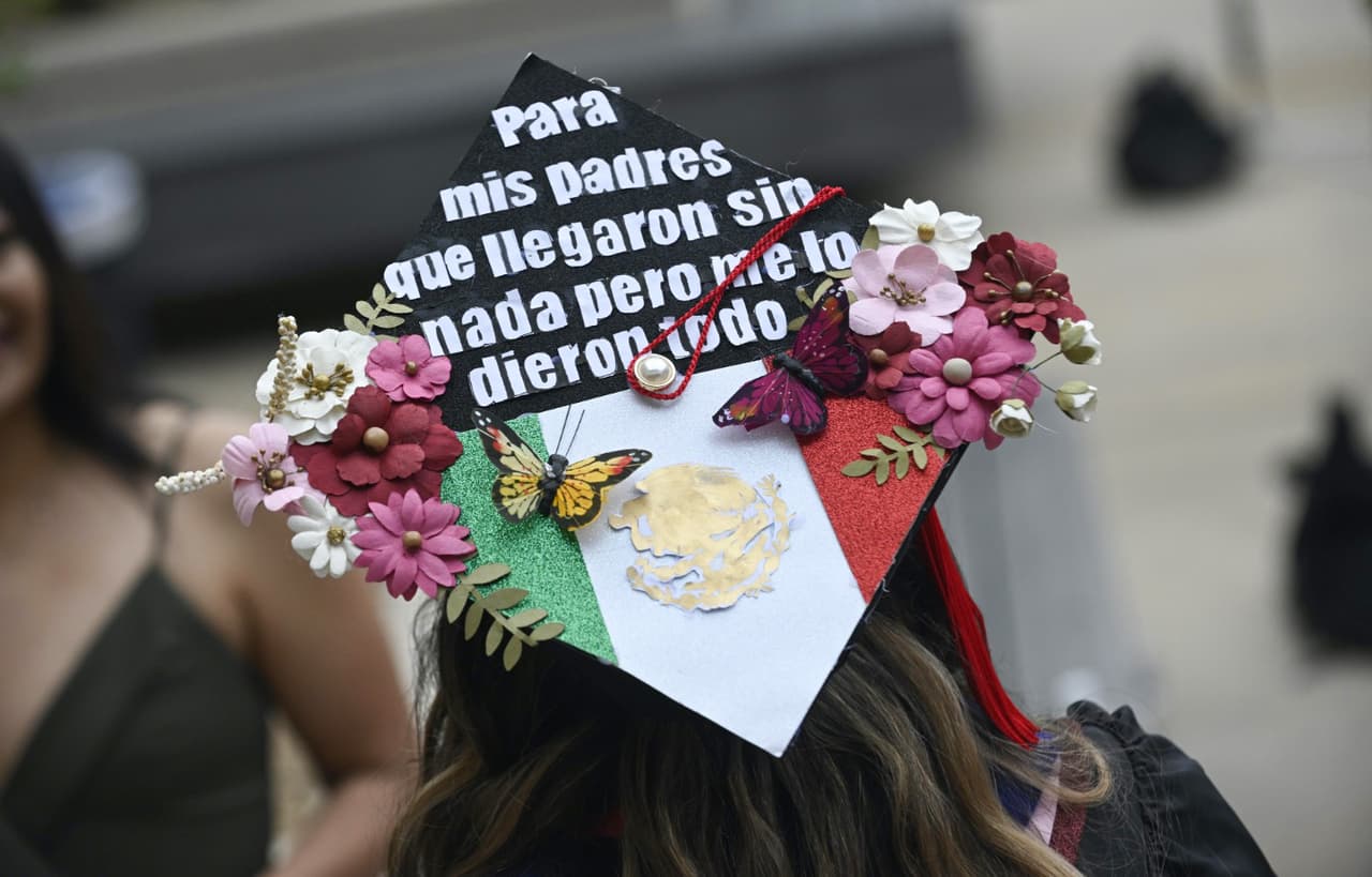 Los graduandos hispanos de la Universidad de Texas en Austin lucieron birretes con mensajes agradeciéndole a sus padres por el esfuerzo que realizaron para que ellos pudieran cumplir sus metas.