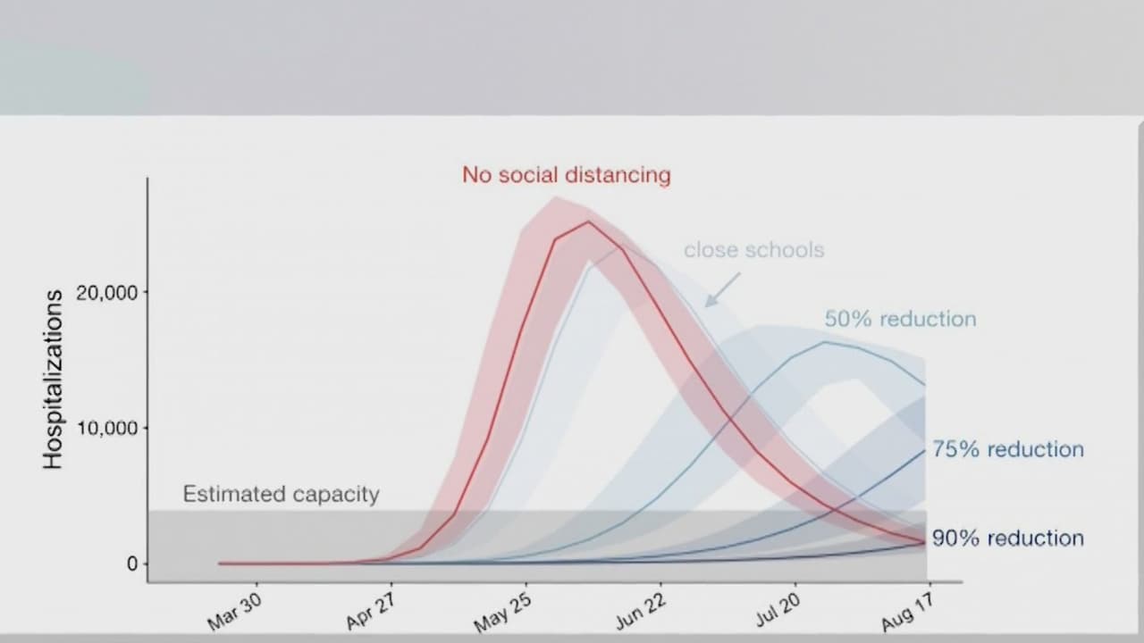 Las simulaciones iniciales de la propagación del virus en el área, utilizando el modelo de pandemia de la Universidad de Texas, mostraron que reducir los contactos diarios en la comunidad en un 50%, o incluso un 75%, puede no ser suficiente para prevenir un aumento inmanejable en las hospitalizaciones en el área de cinco condados (Travis, Williamson, Bastrop, Caldwell y Hays).