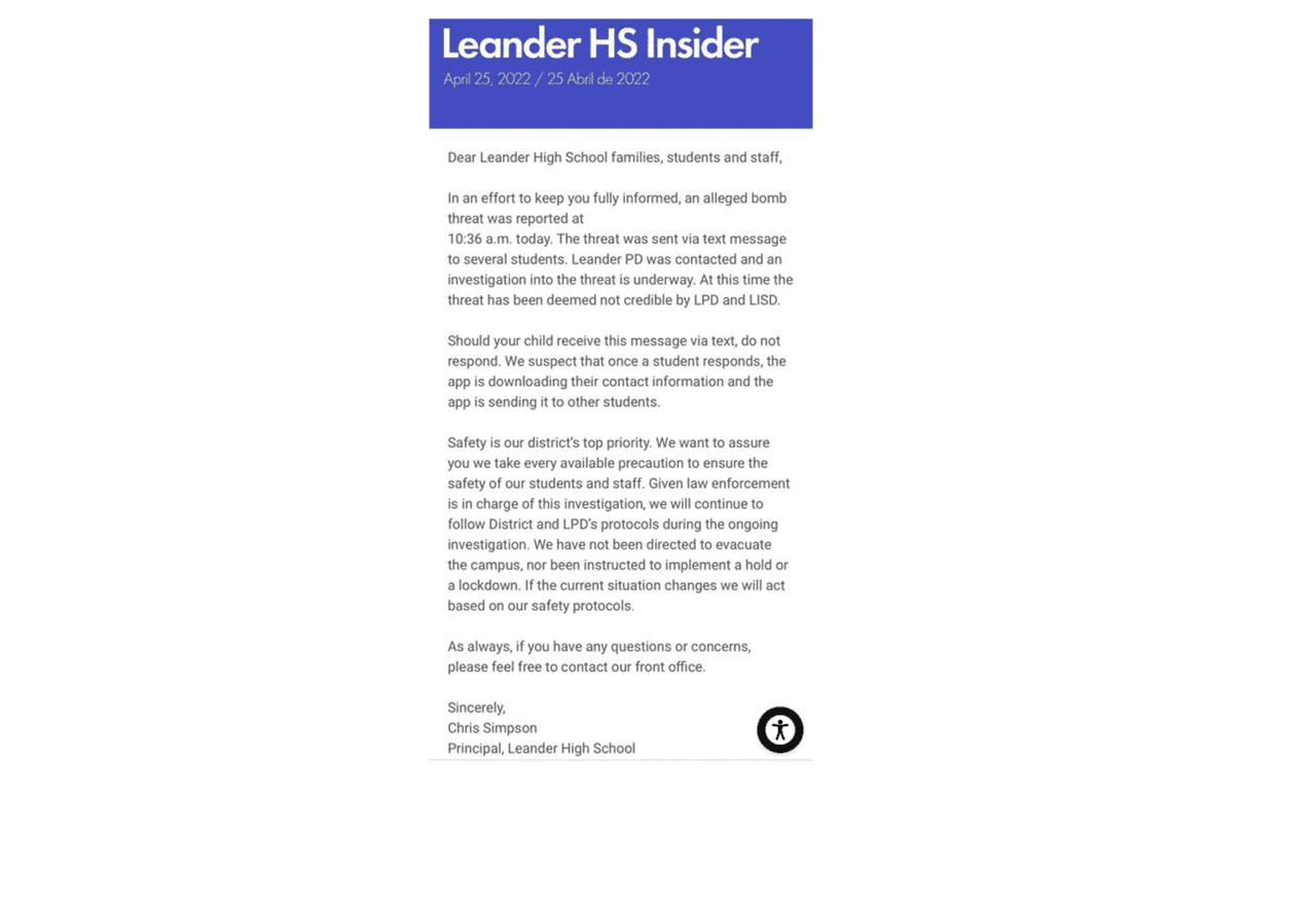 Por medio de un boletín enviado a varios padres de familia de la escuela preparatoria Leander, ubicada sobre 3301 S Bagdad Rd, Leander, TX, se informó a la población estudiantil que la presunta amenaza de bomba fue reportada a las 10:36 a.m. el lunes 25 de abril.