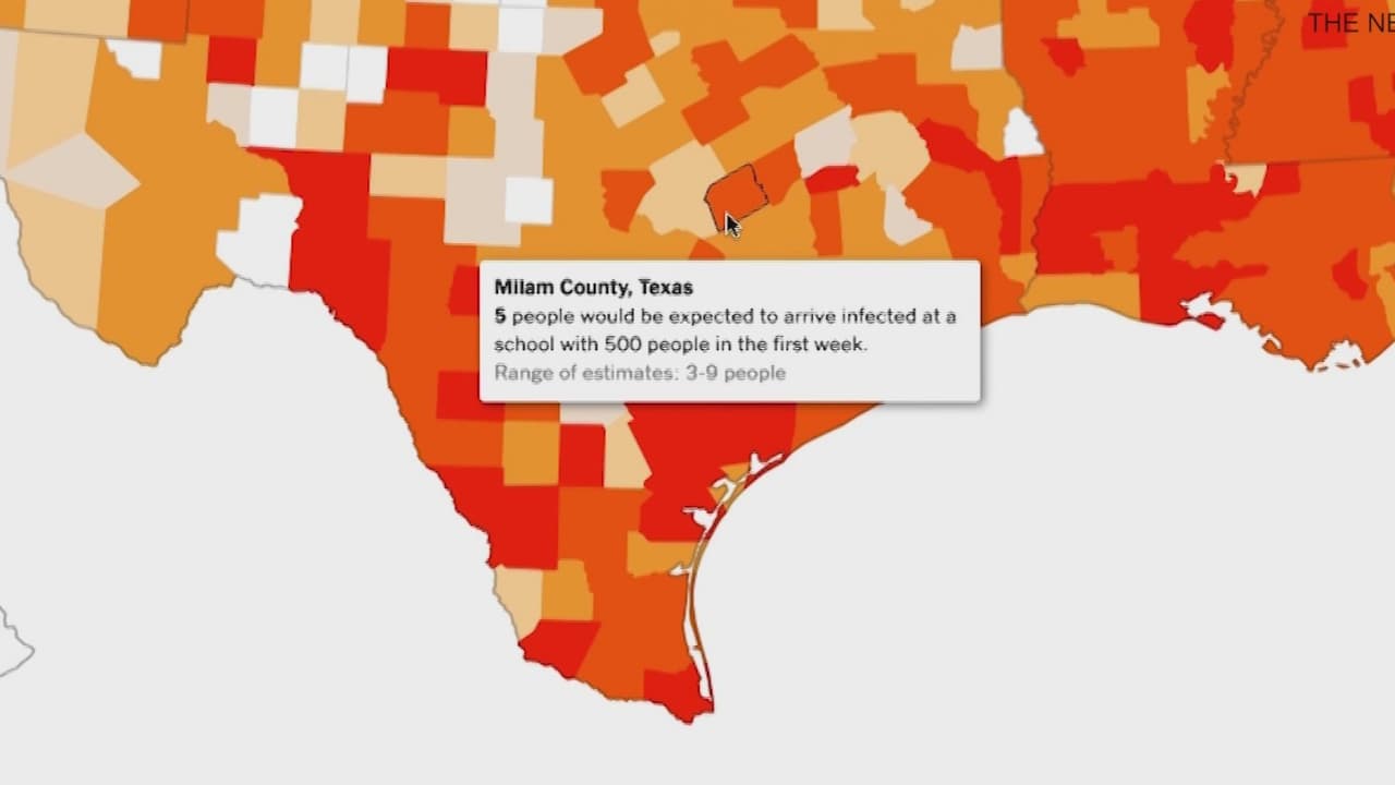 De otra parte, la Universidad de Texas (UT) en Austin creó un mapa interactivo que muestra cuántos estudiantes podrían llegar a las escuelas de Texas ya infectados con coronavirus.