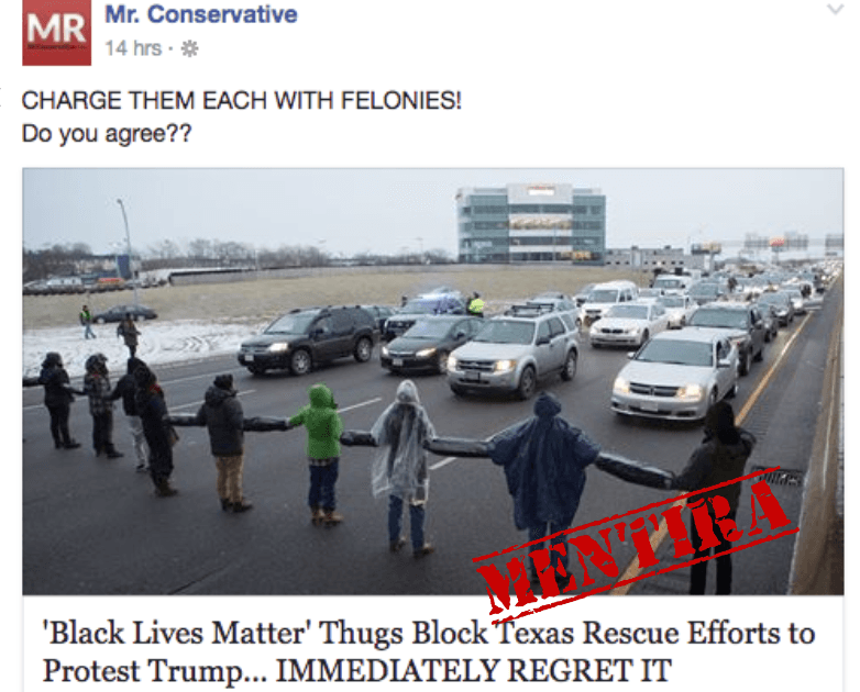 La web Mr. Conservative utilizó en su artículo, publicado el 30 de agosto, una fotografía del año 2015 de una manifestación contra el racismo en Boston, para acompañar la mentira de que los activistas de Black Lives Matter estaban protestado en Texas. Uno de los primeros en señalar esta noticia falsa fue el editor de BuzzFeed News, Craig Silverman.