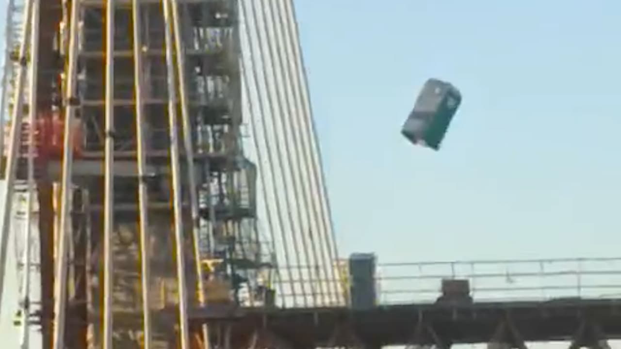 Un video muestra cómo un baño portátil movido por una grúa cayó durante labores de construcción en una autopista en Sevilla, España. Afortunadamente, no se reportaron heridos.