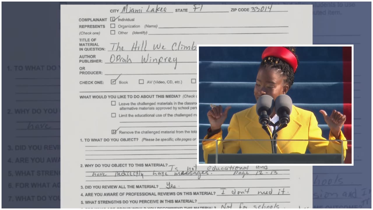 Salinas ganó notoriedad por sus quejas para prohibir libros en la biblioteca de la escuela primaria Bob Graham de Miami Lakes, a la que van sus hijos. Uno de los ejemplares que consiguió fueran retirados del lugar incluye el poema que Gorman leyó en la toma de posesión de Biden.