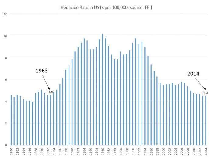 Las cifras manejadas por el FBI indican que en 2015, el último año que tiene registros completos, señalan que la tasa de asesinatos estuvo muy cerca de ser la más baja en 45 años.