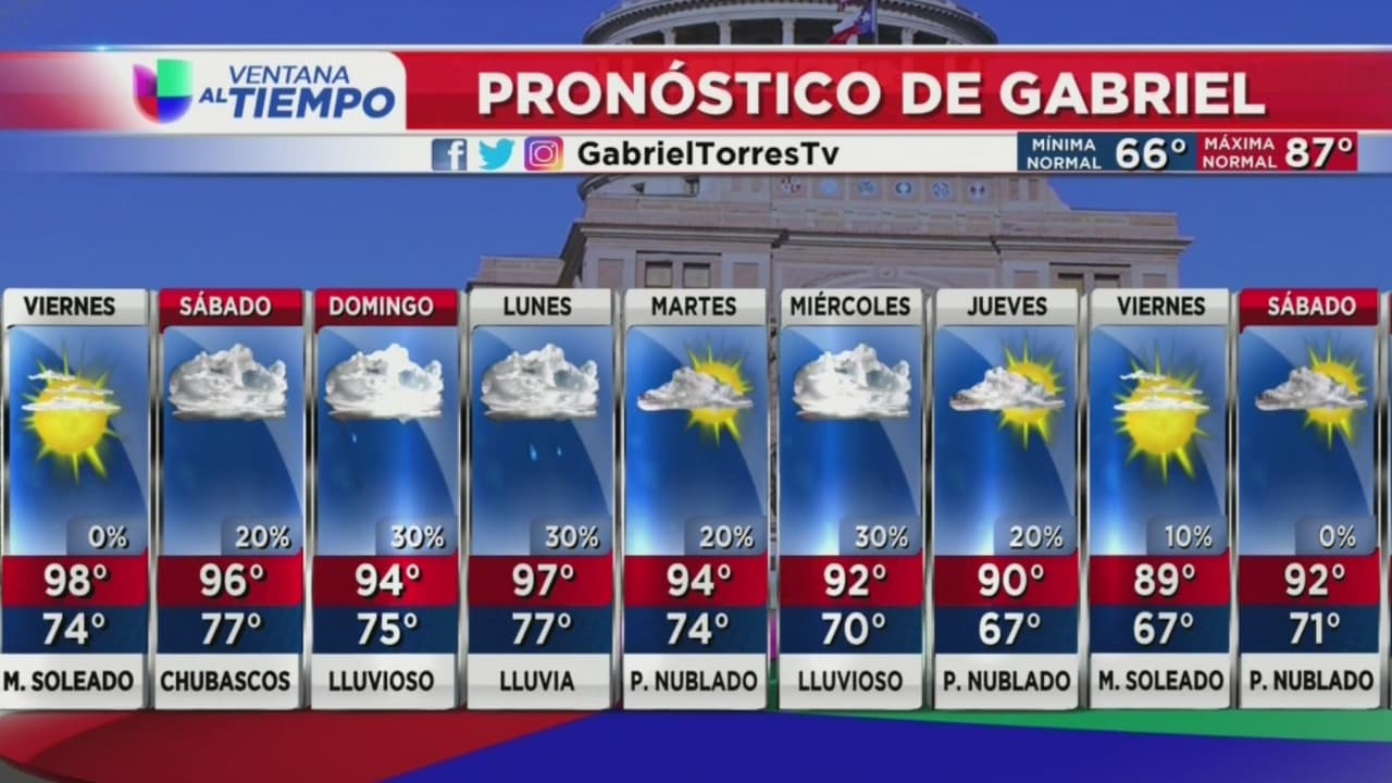 Prepárese para un día con ligera nubosidad y con posibilidades de un 20% de chubascos ligeros, se espera que el mercurio alcance una máxima de 98 grados Fahrenheit.