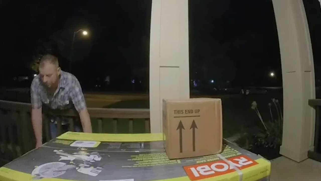 El hombre quedó captado en cámara robando unas cajas de una residencia. Se cree que otras dos personas están involucradas.