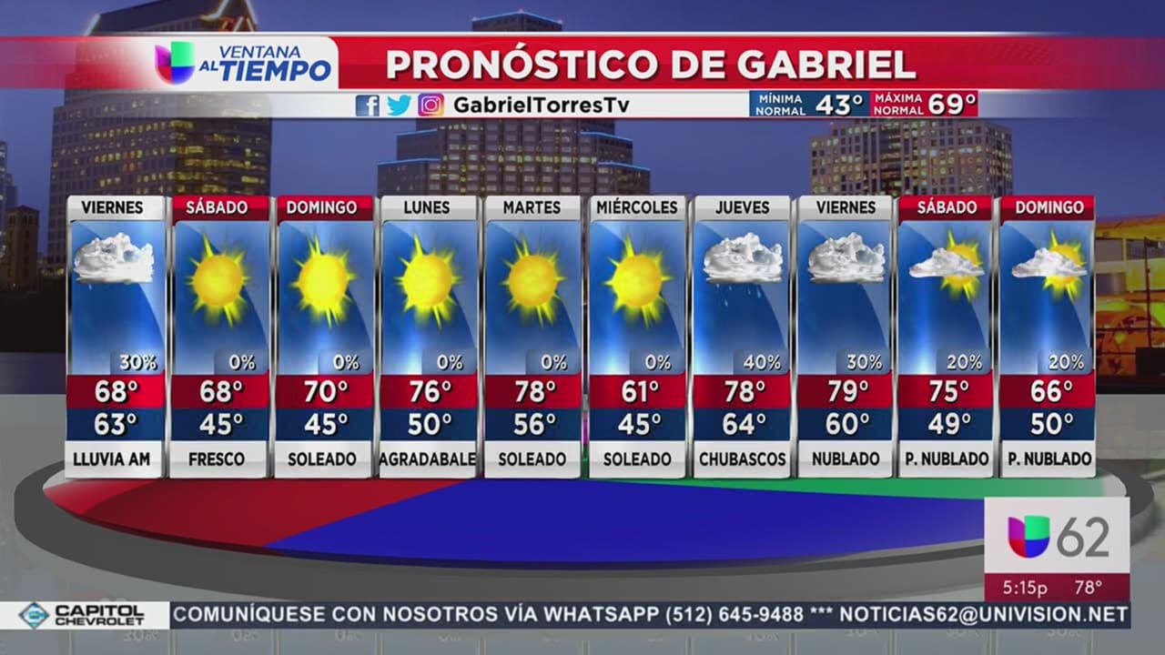 Prepárese para un día con posibilidades de lluvia en la capital texana, se espera que el mercurio alcance una máxima de 68 grados Fahrenheit y una mínima de 63 grados. No olvide el paraguas.