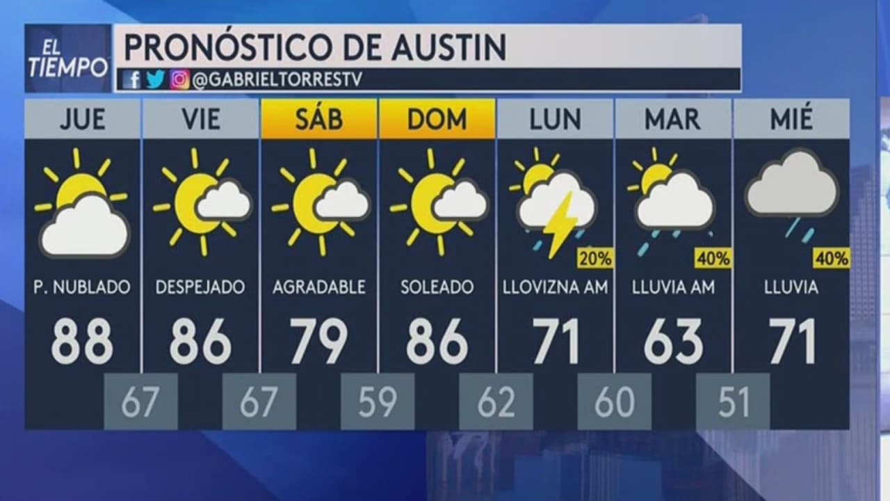 Se prevé un día con ligera nubosidad para la capital texana con temperaturas máximas de hasta 88°F, pero prepárese porque será a partir del lunes de la próxima semana que se presenten lluvias intensas en la región.