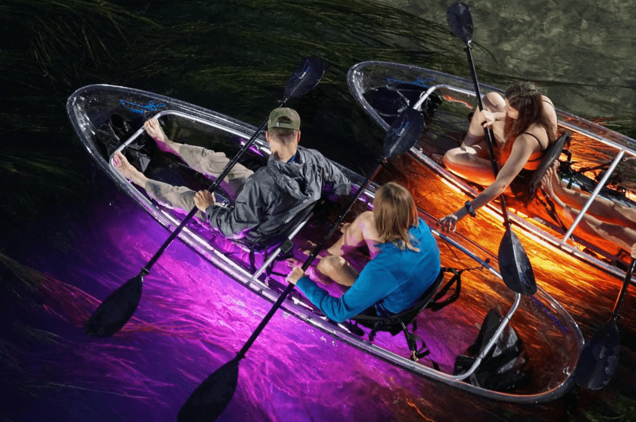 El tour Crystal Kayak Glow planea paseos de noche por el río San Marcos. El paseo se hace en kayaks translúcidos.