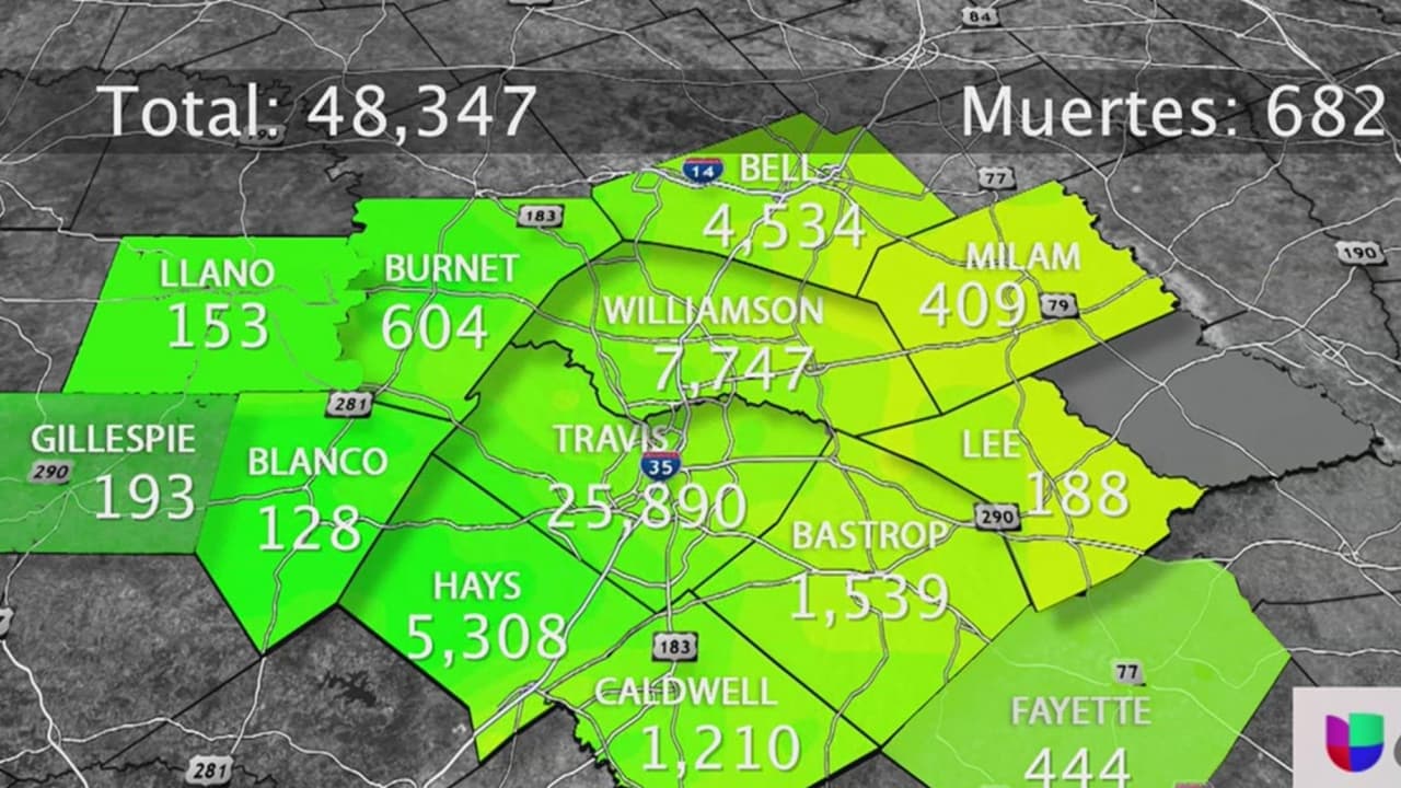 Según cifras el condado de Travis tiene el mayor número de casos con 25,890 seguido del condado Williamson con 7,747 y Hays con 5,308. En total se han registrado 682 muertes.