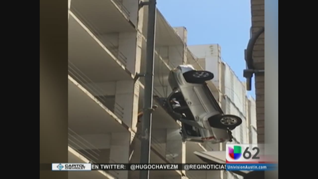 El conductor de una camioneta fue rescatado antes de caer al vacío, al parecer el hombre se quedó sin frenos dentro de un estacionamiento y salió disparado quedando colgando de cables de contención.