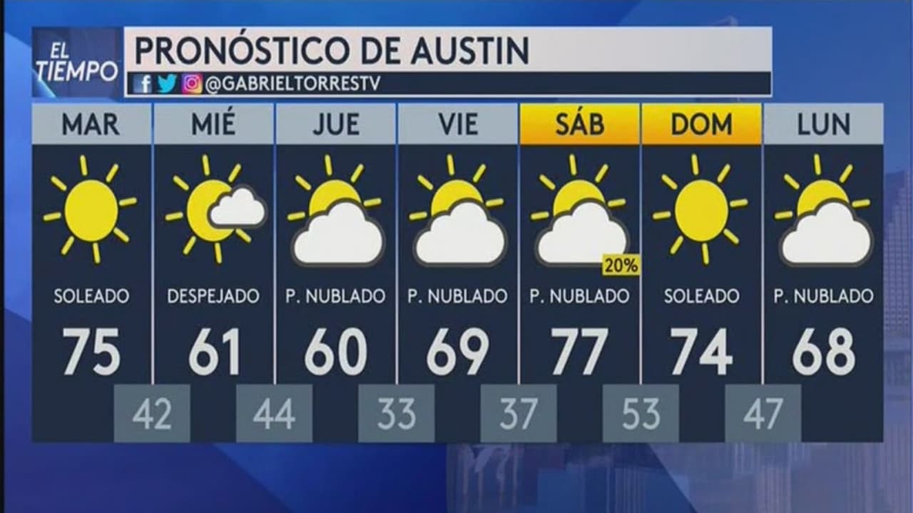 Se espera un día con cielos despejados y soleadas en la capital texana, se esperan temperaturas mínimas de 42°F y máximas de 75°F, será a partir del miércoles que comience a bajar el mercurio.