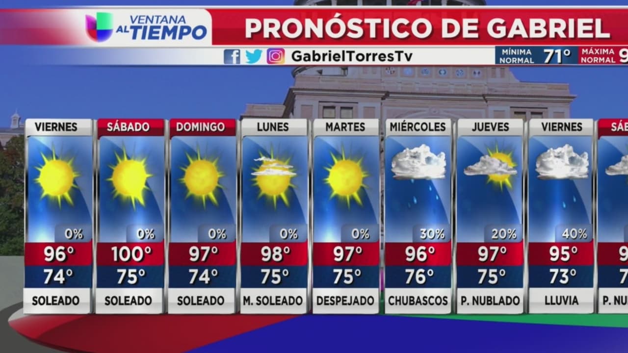 Prepárese para un día con cielos despejados y condiciones secas, se espera que el mercurio alcance una máxima de 96 grados Fahrenheit. Manténgase bien hidratado.