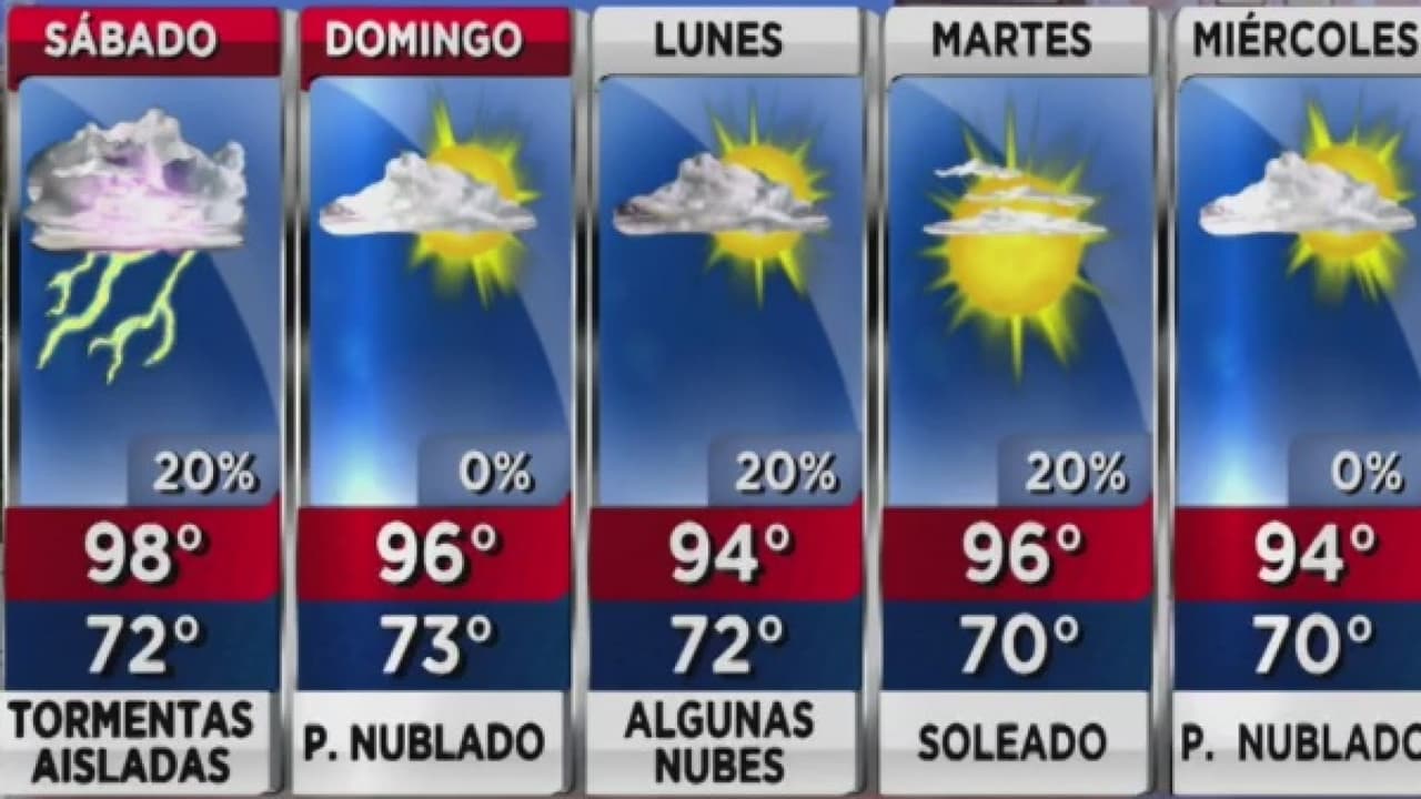 La probabilidad de lluvias y tormentas ronda el 20%, con unos calurosos 98 grados como nivel máximo, con alta humedad.