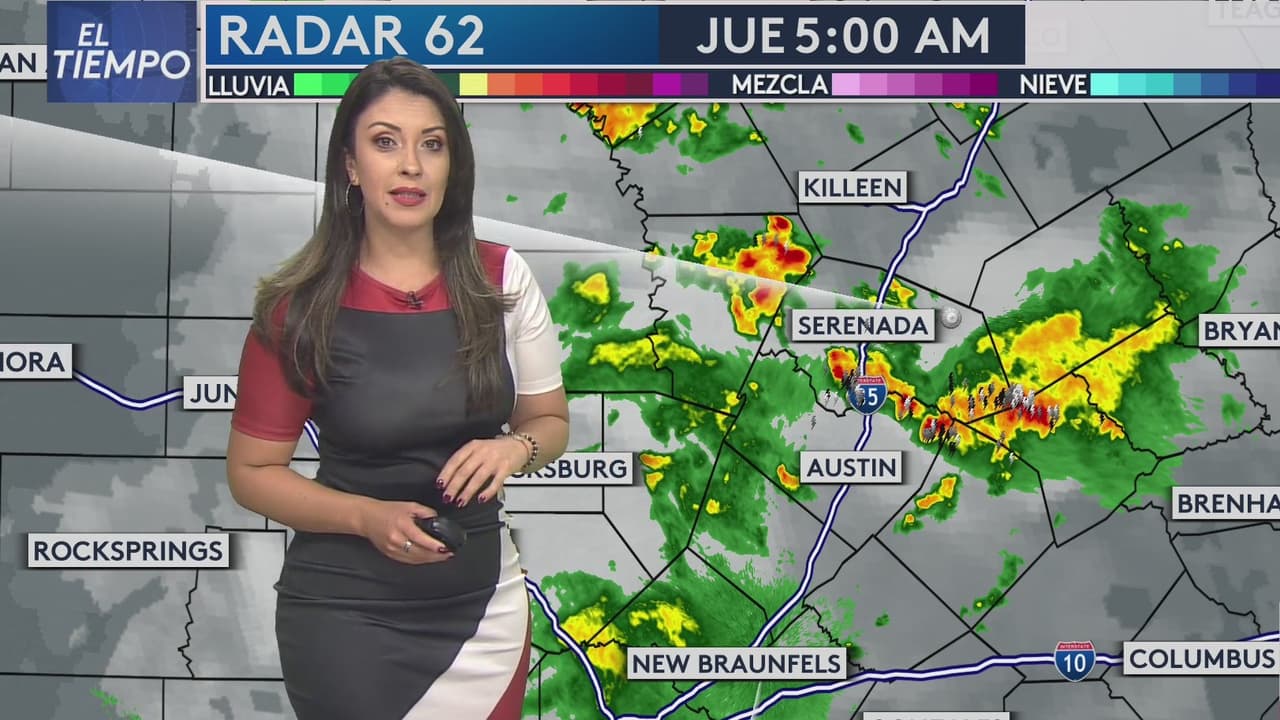 Condados al norte de Austin presentan esta mañana una banda de tormentas, descargas eléctricas y algunas zonas con granizo. Se espera una temperatura mínima de 72 y una máxima de 88 para este jueves.
