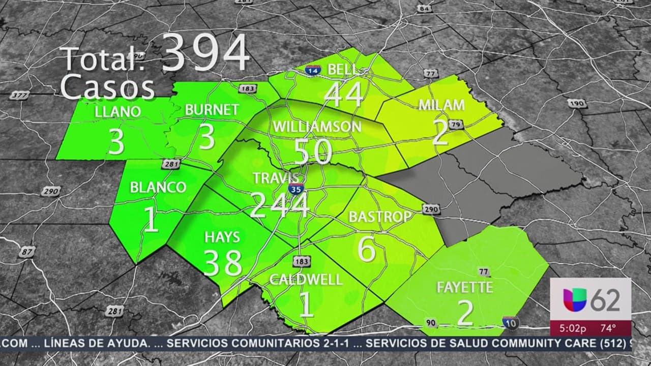 El condado Travis reporta el mayor número de casos con 294, seguido de 50 en Williamsom, 44 en Bell, 38 en Hays, 6 en Bastrop, 3 en Llano y Burnet, 2 en Milam y Fayette y 1 en Blanco y Caldwell. Con un total de 4 muertes registradas.