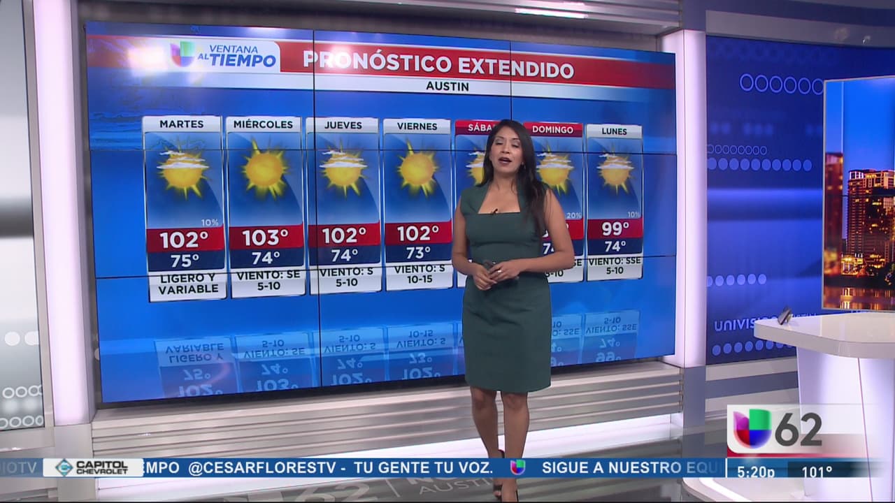 Un inicio de semana con muy bajas probabilidades de lluvia y con temperaturas por arriba de los tres dígitos, para este martes se espera una máxima de 102 grados en Austin. Manténgase hidratado.