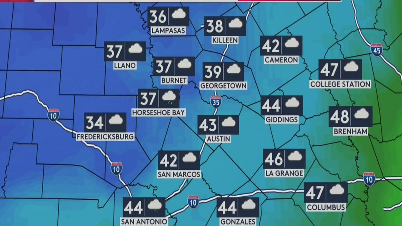 Se espera un día frío y lluvioso en todo el centro de Texas. Los máximos estarán en los 50 grados en el corredor I-35. Las cantidades de lluvia generalmente serán ligeras.