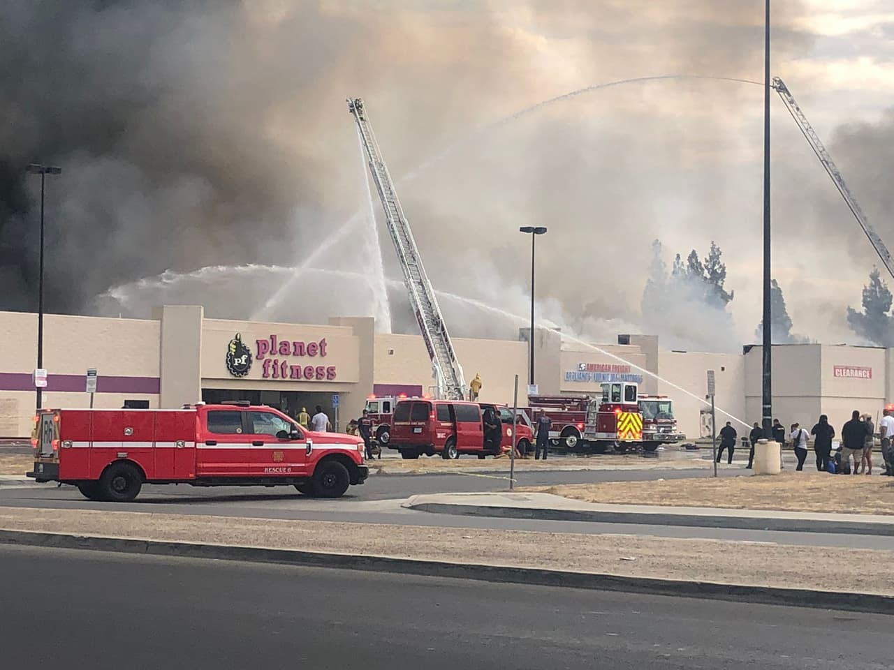 El fuego se extendió desde la tienda Fallas Paredes al local de venta de colchones American Freight y hacia el Planet Fitness. Bomberos de Bakersfield y del Condado de Kern atacan el fuego por varios frentes.