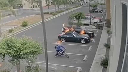 El video muestra al presunto delincuente en el momento en que prendió fuego a dos vehículos con un cocktail molotov a las afueras de un negocio en Delano.