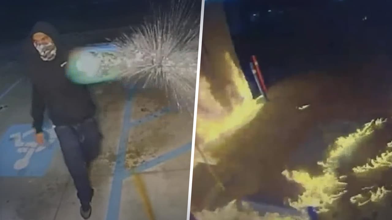 Un video de cámara de vigilancia captó cuando los sujetos arrojaron gasolina en las afueras del negocio, le prendieron fuego y luego fueron alcanzados por las llamas.