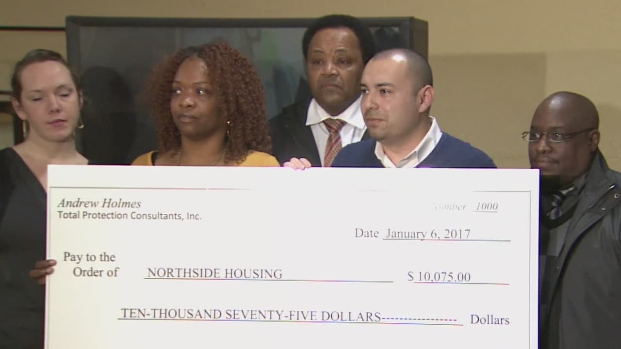 El activista comunitario Andrew Holmes entregó un cheque por 10,075 dólares a la organización Northside Housing, que cuenta con un albergue en el norte de la ciudad.