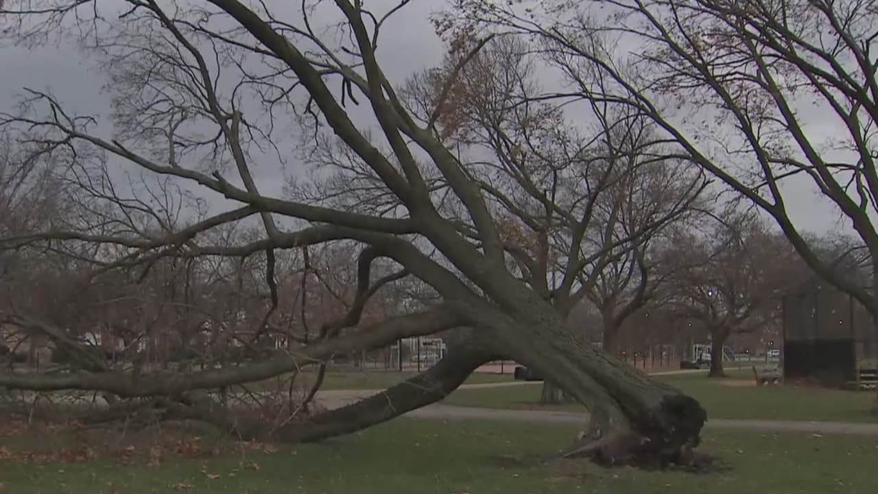 Arboles caídos, lo que dejan los fuertes vientos que azotan el norte de Chicago