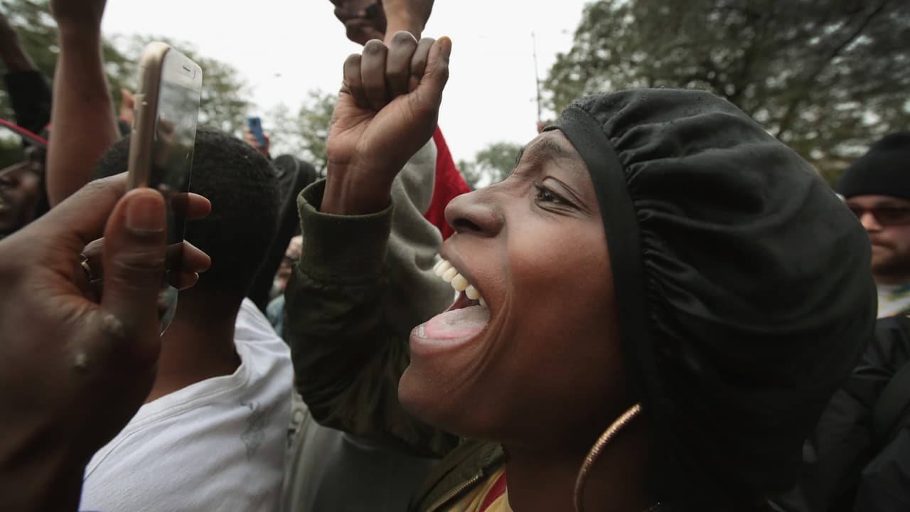 Cientos de personas marchan a la altura de la avenida Michigan y Ontario, en el centro de Chicago, como muestra de júbilo tras el veredicto de culpabilidad. Los negocios de la zona han cerrado sus puertas como medida de prevención ante la posibilidad de protestas violentas, aunque hasta el momento la manifestación se ha realizado de manera pacífica.