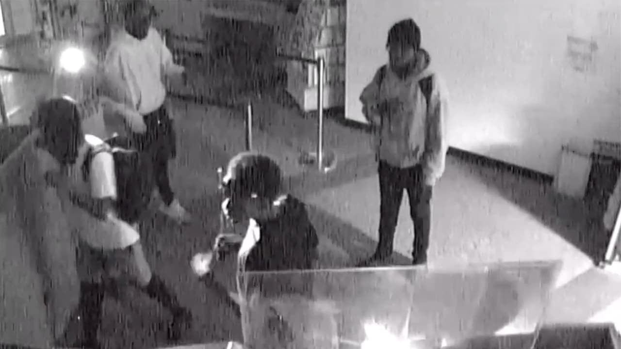 Cámaras de seguridad captaron el momento en el que un grupo de al menos 18 ladrones irrumpió en la oficina postal de Thompson Center este lunes.