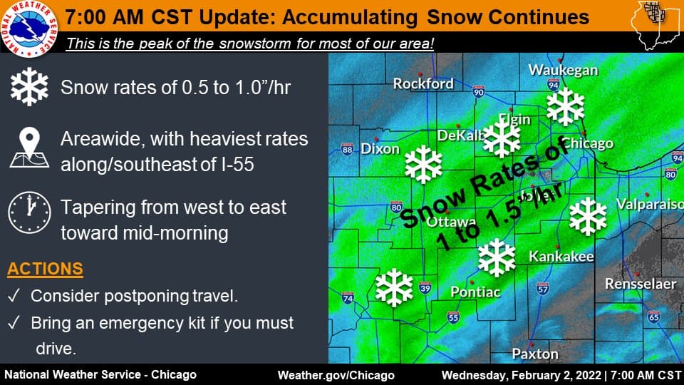 Algunas áreas de Chicago reportan hasta 8 pulgadas de nieve acumulada. La intensidad de caída es de entre 1 y 1.5 pulgadas por hora.
