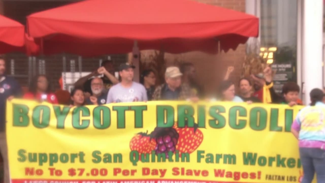 Decenas de personas se manifestaron contra la empresa Driscoll, una de las principales empacadoras de estas frutas que se producen en México. Los manifestantes alegan un salario digno y mejores condiciones laborales.