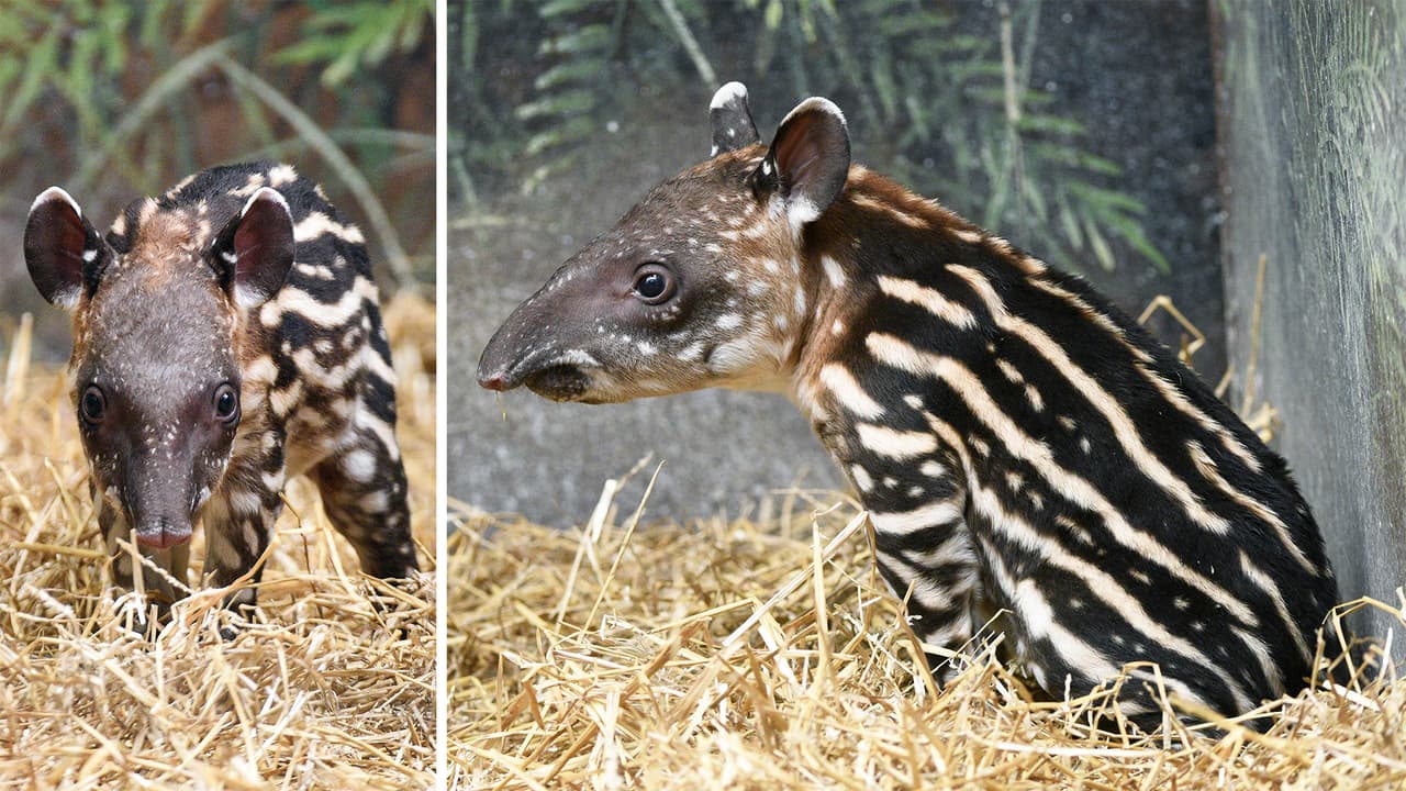 Los tapires nacen con rayas blancas y marrones, que les sirven de camuflaje y que se desvanecen durante los primeros seis meses de edad.