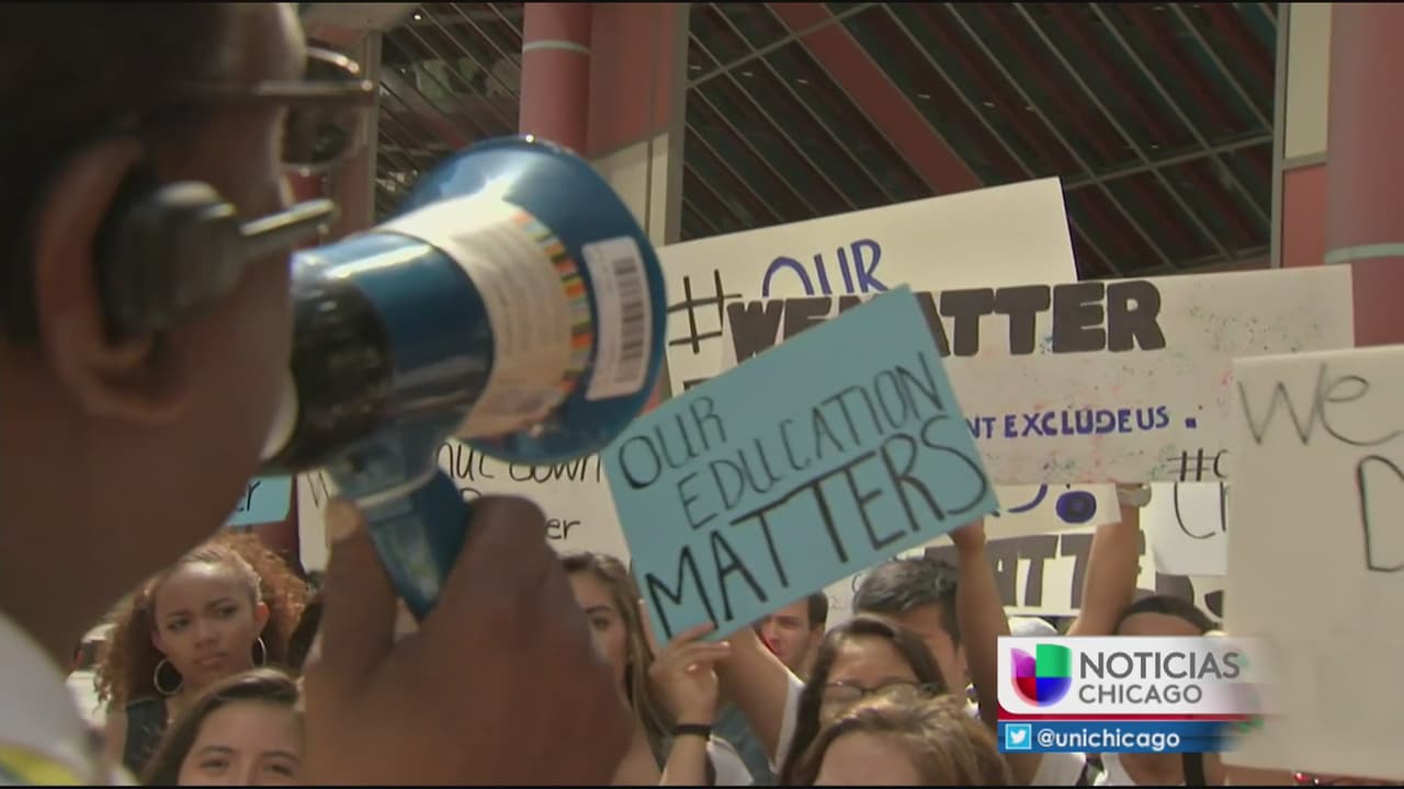 Decenas de estudiantes se dieron cita en el Thompson Center para protestan por recorte a las escuelas y exigir aumento de fondos.