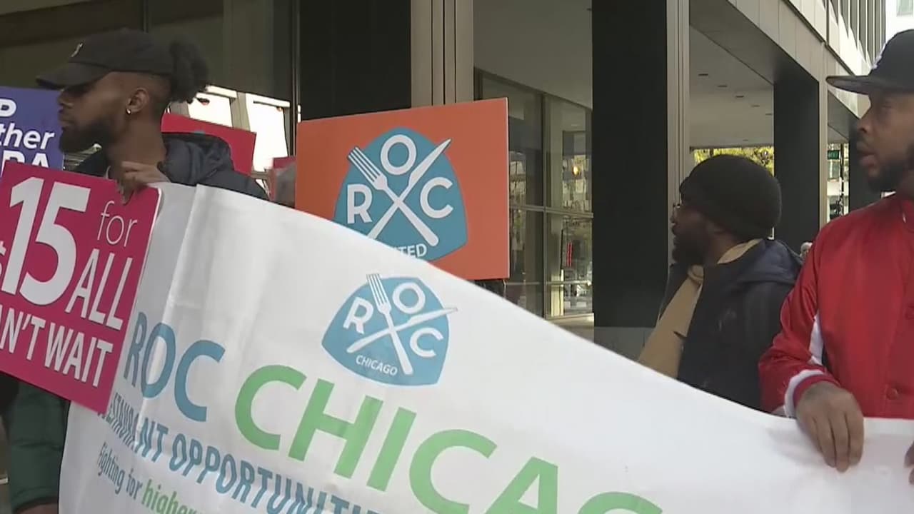 Decenas de trabajadores de restaurantes en Chicago protestan para exigir un aumento en el salario mínimo