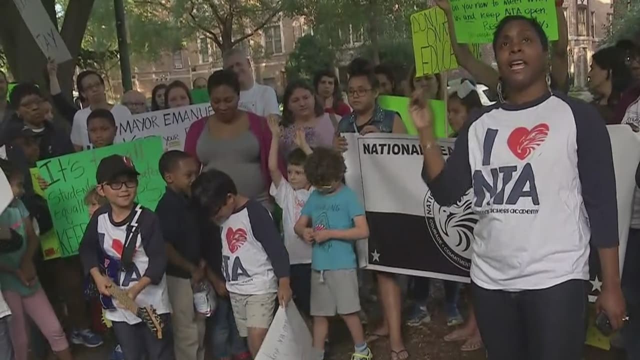 Padres de estudiantes de la escuela NTA realizaron este lunes una manifestación frente a la casa del alcalde Rahm Emanuel para exigir que se suspenda la transformación del plantel en una secundaria, pues desplazaría a 700 alumnos.