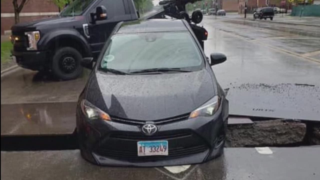 En medio de las lluvias, conductor cae a una zanja que estaba siendo reparada y queda atascado en McKinley Park