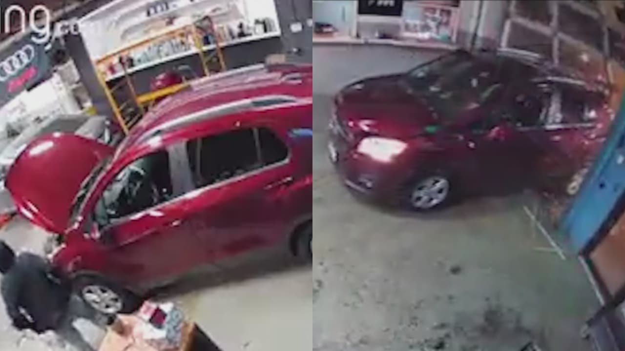 En video: Delincuentes tumban la puerta de un taller de mecánica en Belmont Cragin para robarse un auto