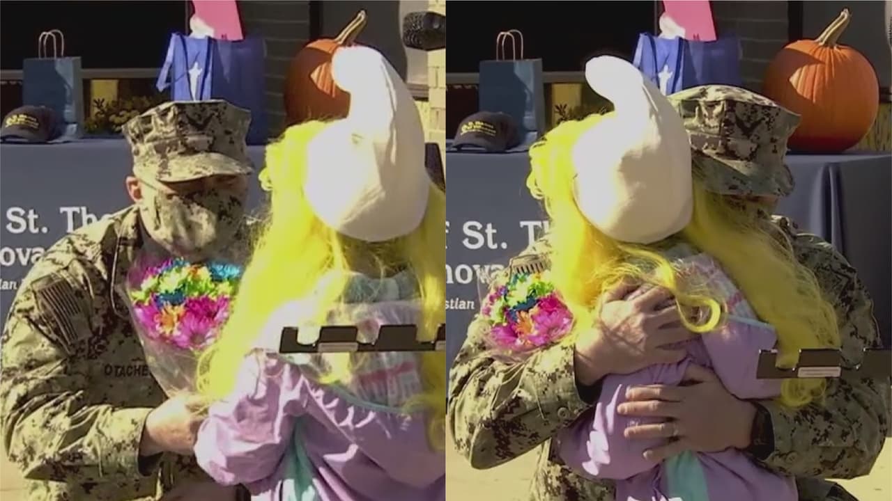 La escuela St. Thomas, en Palatine, fue el escenario donde la pequeña Naomi logró reencontrarse con su padre, Konrad Otacho, quien estuvo más de 15 meses en la Marina de EEUU y permaneció dos semanas en cuarentena. “Estoy muy emocionado y nervioso”, aseguró el hombre, quien no había podido visitar a su familia antes por la pandemia.