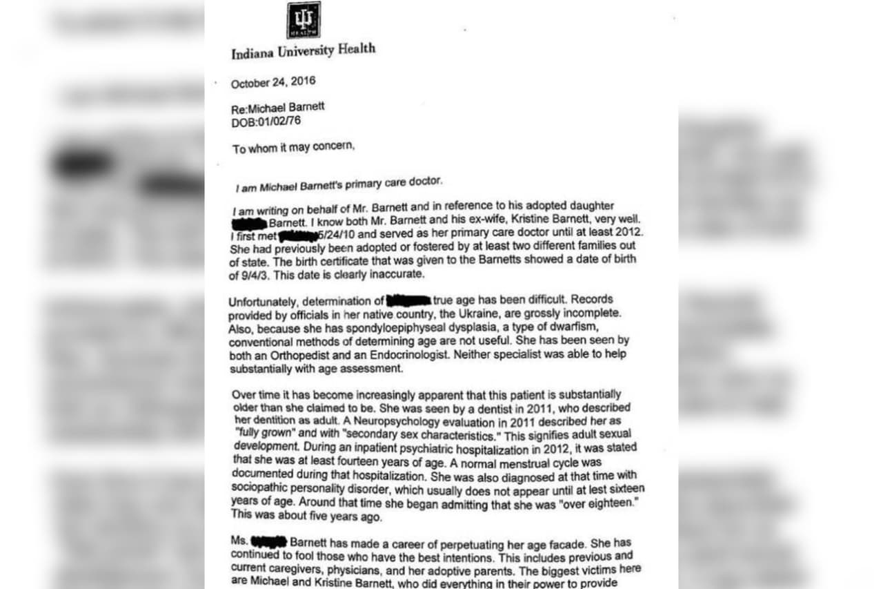La pareja fue a un tribunal de sucesiones de Indiana y cambió legalmente la edad de Natalia a 22 años. Las autoridades aún no han explicado cómo pudieron hacerlo, pero Kristine Barnett le dio a News 8 una copia de una carta supuestamente autorizada por el médico Michael de IU Health que aseguró que la edad de la niña era "claramente inexacta", ya que ella tenía los dientes y las características sexuales de un adulto.