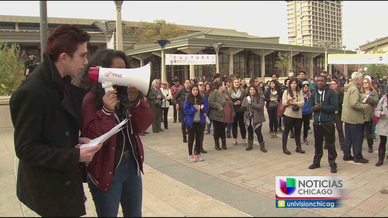 Jóvenes de la Univerisidad de Illinois en Chicago UIC se manifestaron para rechazar el mensaje de división del presidente electo Trump, con esta acción se unen a protestas similares en otras universidades.