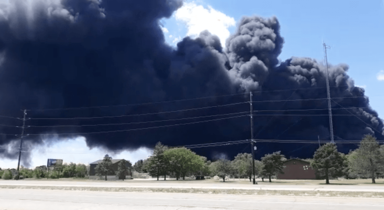 Las grandes llamas de la planta química provocaron que un humo denso cubriera el aire de la zona. La fuego ha estado activo desde las 7 am y el humo continúa yendo hacia el sur y el sureste.