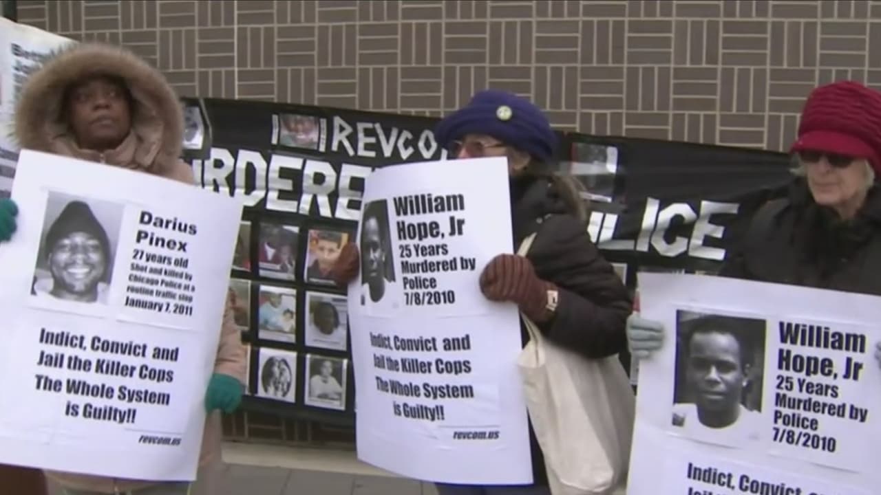 Con carteles de Dario Pinux, quien murió en el 2011, y William Hope, fallecido en el 2010, allegados y líderes comunitarios se manifiestan contra el programa que convertirá a los oficiales en instructores.
