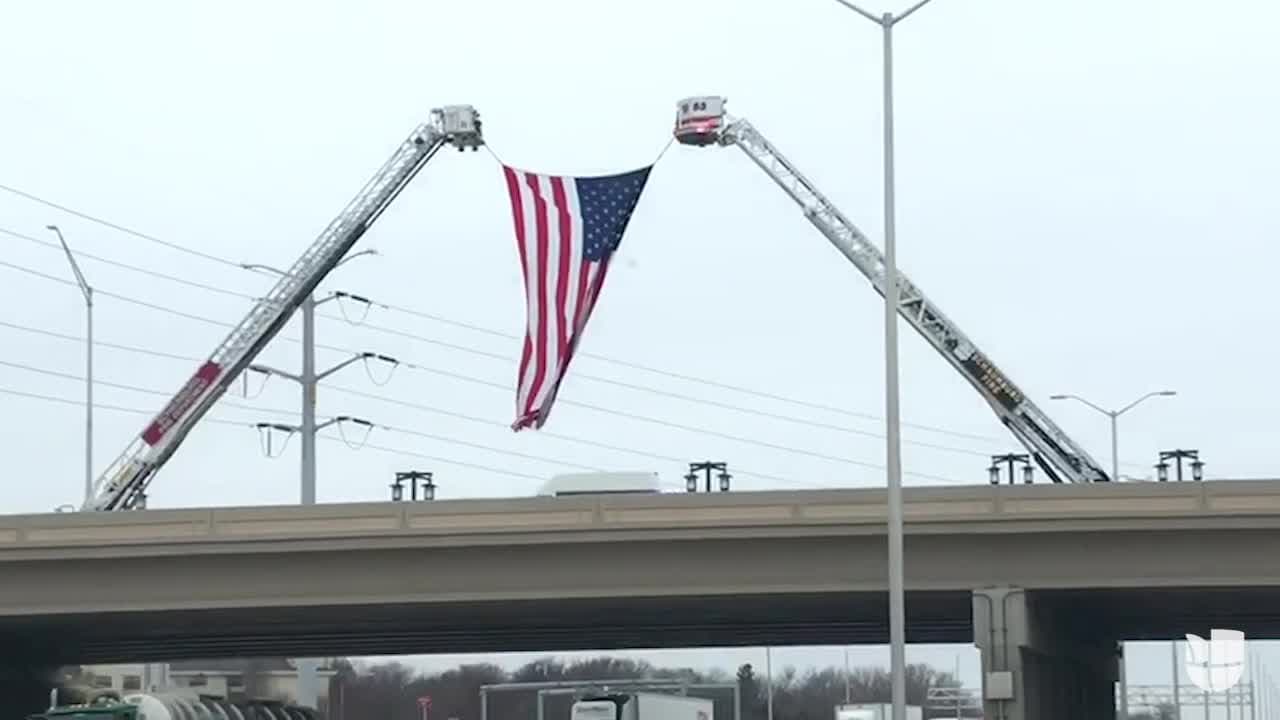 Desde autopista 90-94 en dirección a Elgin, una enorme bandera estadounidense ondea desde dos camiones de bomberos como parte del homenaje al policía estatal, Christopher Lambert, arrollado fatalmente el sábado 12 de enero mientras investigaba un accidente vehicular. Cortesía de Vanessa Pérez.