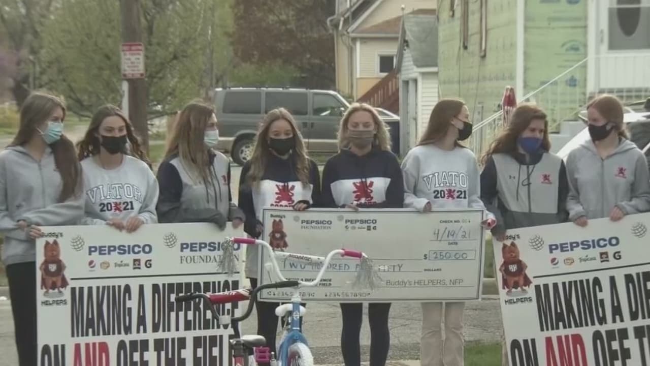 Como parte del programa Making a Difference on and off the Field, un grupo de estudiantes le entregó a los pequeños de la familia unas bicicletas y a la madre 200 dólares para que los done a una organización sin fines de lucro de su preferencia.