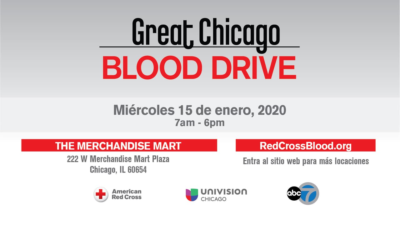 Las citas se pueden hacer descargando la aplicación American Red Cross Blood Donor visitando redcrossblood.org (ingrese el código del patrocinador: ABC7Chicago) o llamando al 1-800-RED CROSS (1-800-733-2767) para hacer una cita antes del conducir o para más información. Todos los tipos de sangre son necesarios. Se requiere una tarjeta de donante de sangre o licencia de conducir u otras dos formas de identificación al momento del check-in.